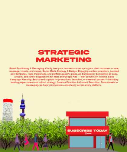For businesses needing consistent content and strategic execution. Our creative marketing solutions bundled up in a monthly subscription assists your business in marketing through social media, google ads and youtube. Advertising your business to the right audience to ensure you ROI.