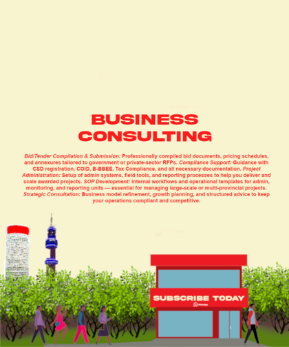 Business Consulting - Bid/Proposal/Tender compilation, project administration, and government contract support with a compliance-first approach. Marketing Services - From campaigns to content, we portray the right image for your business through impactful digital and promotional strategies. Web & Branding - Professional websites, branding tools, and promotional materials built to convert attention into action